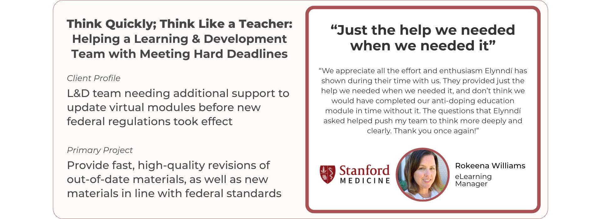 In teaching, the Gradual Release of Responsibility model is a tool for scaffolding that organizes work into “I Do” (the instructor models), “We Do” (the instructor and learners work together), and “You Do” (learners take more ownership while still supported). For the Stanford CME project, we treated these not as sequential steps, but as buckets of activity that we moved between fluidly depending on the task at hand.In the “I Do” bucket, Elynndí produced complete, regulation‑aligned module sections from start to finish—integrating the updated WADA/USADA standards, sourcing graphics from Stanford’s repositories, creating Vyond animations for technical procedures, and drafting scenario‑based assessments for USADA review. These pieces set a visible benchmark for content quality, design structure, and compliance alignment.In the “We Do” bucket, we worked side‑by‑side with the CME team on new content, coordinating through Asana to divide tasks, track deliverables, and make real‑time decisions on text, media, and pacing. This also included joint revision sessions, where we refined earlier sections based on updated guidance from regulatory partners.In the “You Do” bucket, the CME team took a stronger lead on drafting and initial editing for certain sections, while we provided focused review, animation production, and instructional refinements. This arrangement allowed parallel work without sacrificing consistency: in other words, the CME team could move quickly, knowing we were still embedded in the process to ensure each section met compliance and design standards.Using these buckets kept the work flexible, collaborative, and efficient—shifting responsibility fluidly as needed, rather than forcing a rigid progression, so the project could meet an immovable deadline without losing quality.