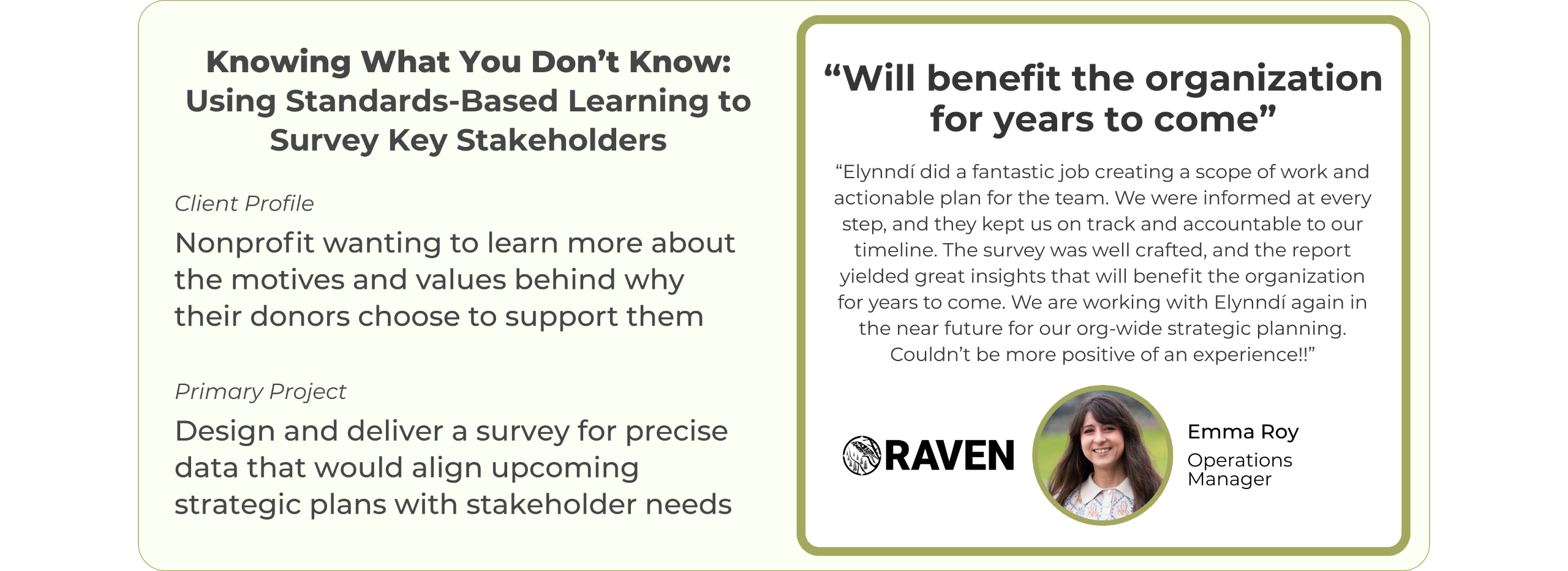 Standards-based assessment provides a clear framework for deciding what information is essential to gather and how it should be sequenced. For RAVEN, this approach ensured the survey was more than a basic list of questions that determined donors’ surface-level strengths, weaknesses, and needs. Instead, it was a structured and reciprocal learning tool that guided donors through a progression from self-reflection, to awareness of others, to a vision for collective action—providing RAVEN with thorough insight into that progression.By defining “learning standards” before writing any questions, the survey design stayed focused on what RAVEN most needed to know to align strategy with donor priorities. This prevented the common pitfall of collecting large amounts of unfocused data that is difficult to interpret or apply.In practice, this meant RAVEN could do more than simply analyze what donors believed or valued: it also allowed the team to check, even during the prototype stage, whether responses were aligning with the standards the survey was designed to address. This made it possible to refine the survey before launch, ensuring that the final version produced data that was both meaningful and actionable, while staying true to the intended learning objectives.