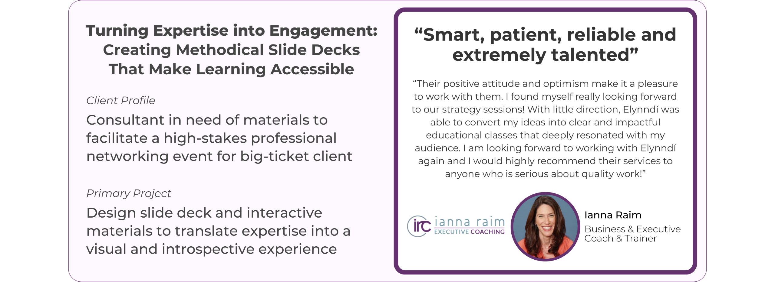 At Ianna Raim Executive Coaching, Ianna Raim was an ICF-accredited coach who had built her practice on one-on-one professional coaching for attorneys at a major law firm. Her work focused on helping individual legal professionals identify goals, navigate complex workplace dynamics, and develop leadership skills.For the first time, she was tasked with designing and leading a large-scale, public-facing event for over 90 legal professionals at once. The stakes were high: her client, a prominent big-law firm, wanted the program to center on how women professionals could challenge and redefine a legal culture historically shaped by men.