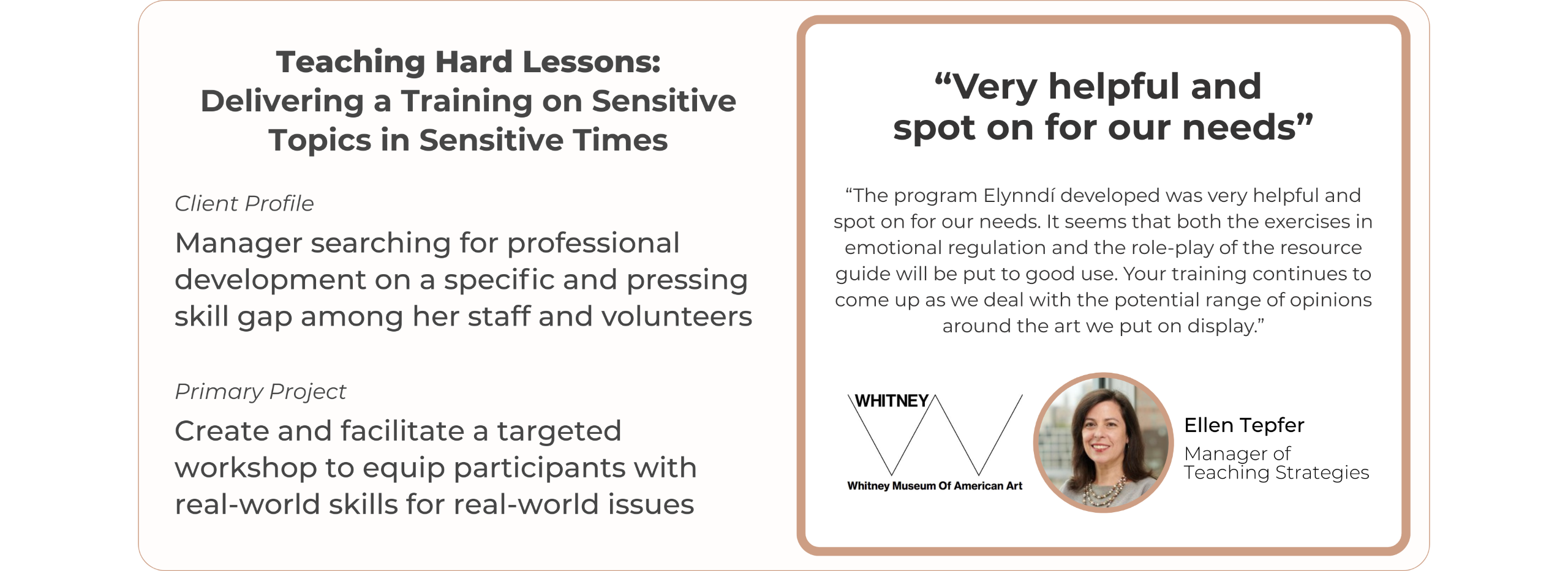 The museum’s leadership identified a pressing skill gap: while their staff and volunteers were knowledgeable about the art and capable of delivering engaging tours, they lacked the practical skills needed to de-escalate conflict, respond to politically charged remarks, and maintain constructive dialogue in high-stress situations. This environment prompted the Whitney to seek targeted professional development focused on equipping their team with real-world skills for handling sensitive conversations in sensitive times.Finding a training provider in time to address these pressing and persistent issues proved difficult. The museum needed a partner who could combine three distinct capabilities: experience designing workshops for both staff and volunteer populations, expertise in navigating sensitive or politically charged topics without alienating participants, and the ability to translate concepts into actionable skills that could be applied immediately on the museum floor. Many potential vendors specialized in only one of these areas—either they focused on general customer service skills without addressing the political context, offered abstract diversity or inclusion training without practical de-escalation techniques, or lacked experience working with arts institutions and their unique public-facing roles.